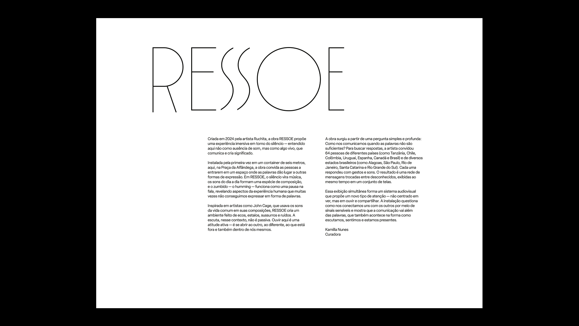 Em 2025, desenvolvemos a identidade tipográfica para a exposição gratuita da videoinstalação Ressoe, da artista Ruchita, realizada no Largo da Alfândega, em Florianópolis.